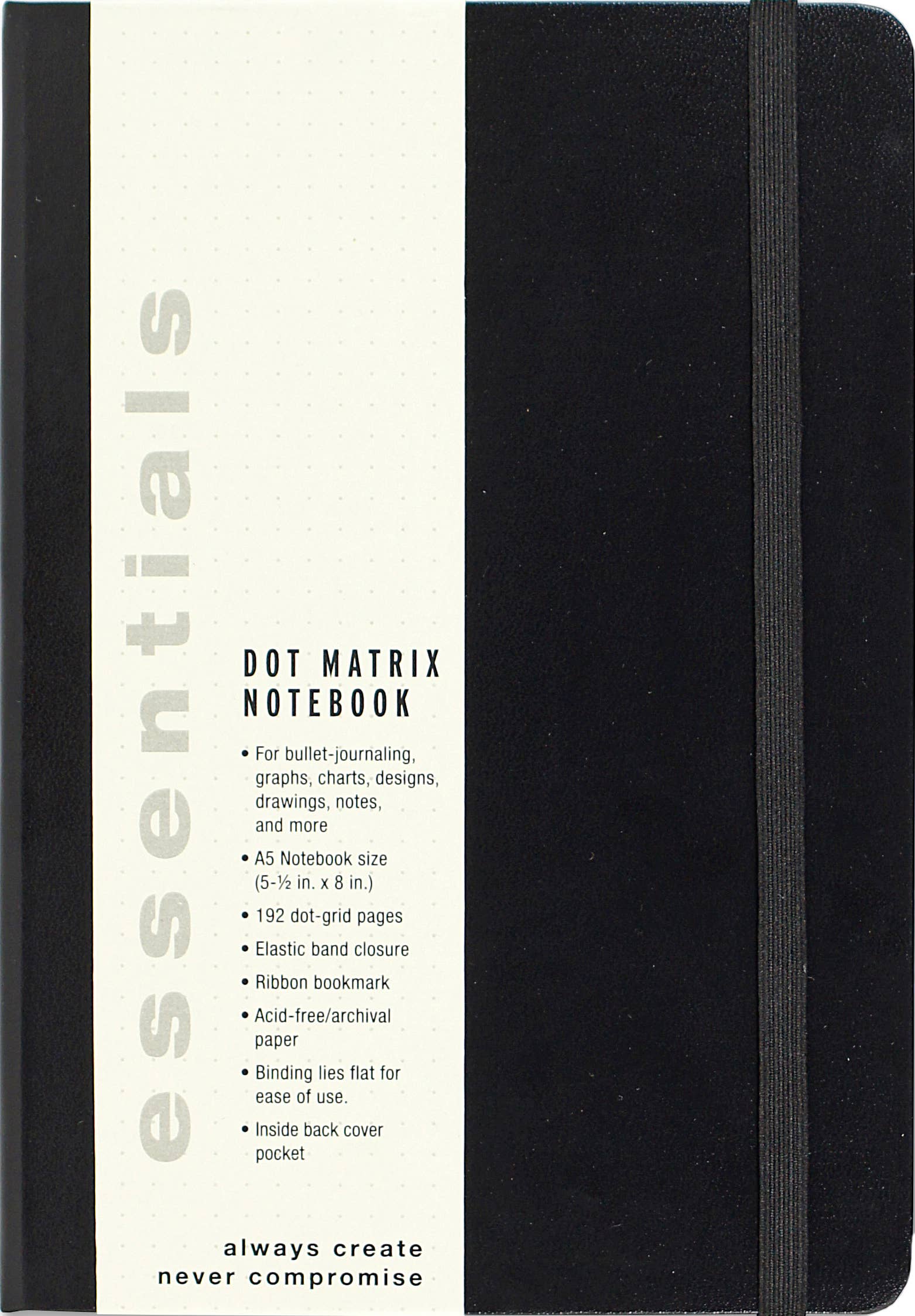 Ideal for bullet/dot journaling! Dot matrix (or dot grid) pages are the preferred alternative to traditional ruled or graph pages. Multi-purpose dot matrix pages are ideal for planning, creating charts and graphs, writing, and sketching, as well as for bullet journaling and other dynamic note-taking methods. High-performing Essentials Notebooks feature 25% heavier paper stock than other leading brands. Premium 120-gsm acid-free archival-quality paper supports pens, pencils, and other media. Inside back cover pocket expands to hold notes, business cards, and other flat items. A ribbon bookmark keeps your place. The elastic closure keeps it all together. Durable hardcover binding. Removable label. Notebook is A5 size (5-3/4'' x 8-1/4''). 192 dot-grid pages.